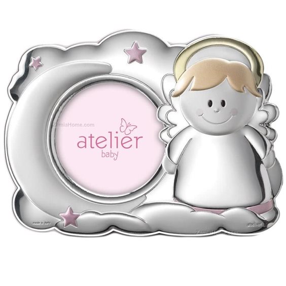 ATELIER BABY Cornice in argento bilaminato con dettagli colorati. Misura 13X17 cm, spazio foto circolare diametro 7 cm. Appoggio sagomato per uso verticale e orizzontale. Struttura in legno laccato rosa o azzurro satinato. Confezione in scatola di cartone originale con garanzia Made in Italia