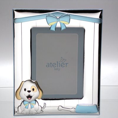 ATELIER BABY Cornice in argento bilaminato con dettagli colorati. Misura 14x18 cm, adatto a foto 9x13. Appoggio sagomato per uso verticale e orizzontale. Struttura in legno laccato rosa o azzurro satinato. Confezione in scatola di cartone originale con garanzia Made in Italia