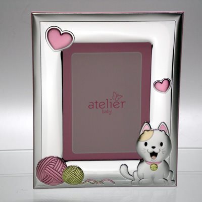 ATELIER BABY Cornice in argento bilaminato con dettagli colorati. Misura 20X24 cm, adatto a foto 13X18. Appoggio sagomato per uso verticale e orizzontale. Struttura in legno laccato rosa o azzurro satinato. Confezione in scatola di cartone originale con garanzia Made in Italia