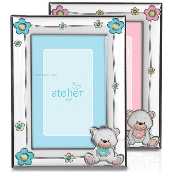 ATELIER BABY Cornice in argento bilaminato con dettagli colorati. Misura 20X24 cm, adatto a foto 13X18. Appoggio sagomato per uso verticale e orizzontale. Struttura in legno laccato rosa o azzurro satinato. Confezione in scatola di cartone originale con garanzia Made in Italia