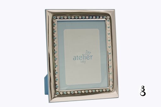 ATELIER BABY Cornice in argento bilaminato con dettagli colorati. Misura 18X22 cm, adatto a foto 13X15. Appoggio sagomato per uso verticale e orizzontale. Struttura in legno laccato rosa o azzurro satinato. Confezione in scatola di cartone originale con garanzia Made in Italia