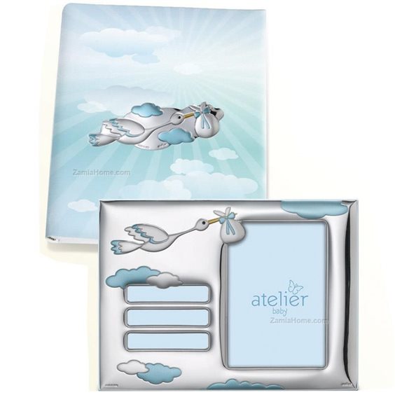 ATELIER BABY Cornice in argento bilaminato con dettagli colorati. Misura 16X22 cm, adatto a foto 13X15. Appoggio sagomato per uso verticale e orizzontale. Struttura in legno laccato rosa o azzurro satinato. Confezione in scatola di cartone originale con garanzia Made in Italia