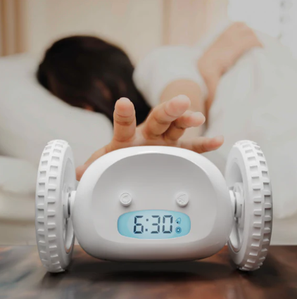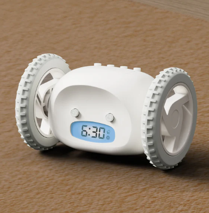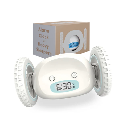 Clocky è la sveglia che scappa via suonando per farti alzare dal letto. La maggior parte delle persone "abusa" della funzione snooze ogni mattina. Clocky non ti fa più dormire troppo. Se la posticipi, Clocky salterà giù dal tuo comodino e scapperà suonando, assolutamente determinata a farti alzare dal letto in tempo. Scappa emettendo un segnale acustico sul tappeto o sul legno Resistente! Salta da 90 cm di altezza Forte suono robotico simile a R2D2 Opzione per posticipare una volta o disattivare la funzione snooze Opzione per disattivare le ruote/funzione di allontanamento