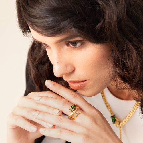 Anello in bronzo dorato a spirale con testa di serpente e finitura in smalto verde. Scaglie lucenti e texture preziosa, Unoaerre interpreta con grande capacità plastica il tema stilistico animalier in un anello seducente e figurativo che avvolge con sensualità ed eleganza estrema le dita.