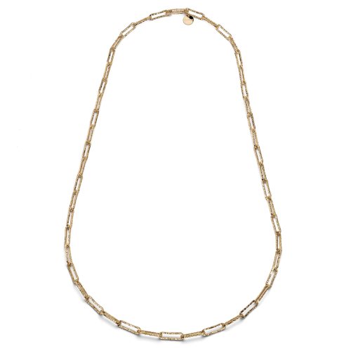 Collana lunga di catena "paper clip" in finitura diamantata. Una collana chanel elegante e luminosa, perfetta per regalare un tocco di luce in più ed accendere il tuo stile. Materiale: Bronzo Colore: Giallo/Dorato Lunghezza: 93,00 cm Bagno galvanico: oro giallo 24k Finitura: diamantata Chiusura: gancetto ad amo