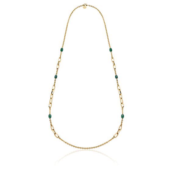 UNOAERRE FASHION JEWELRY Collana lunga con catena forzatina fantasia, malachite verde e chiusura a moschettone. Lunghezza 113 cm. La catena fine e leggera è pensata per mettere in risalto il colore intenso degli elementi in malachite che si alternano lungo la collana. Un gioiello iperfemminile per conquistare al primo sguardo. Indossabile anche a due giri. Gioiello anallergico.