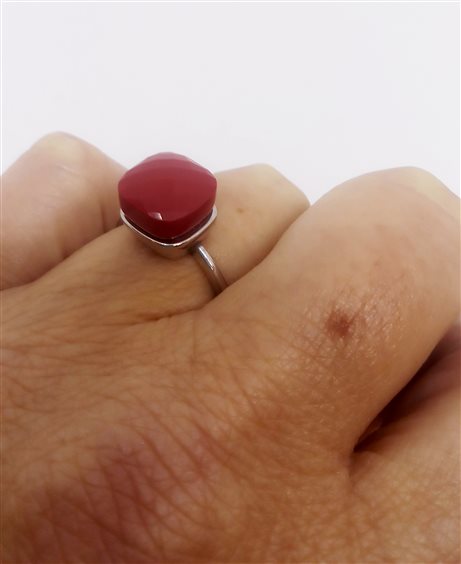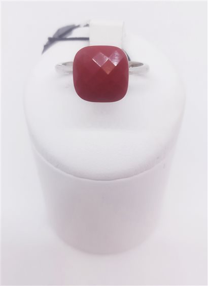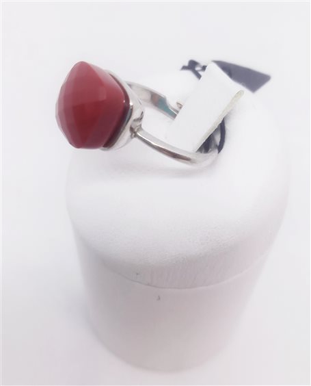 VENERIO ARGENTO Anello modello Pomellato in argento 925 rodiato con pietra quadrata in cristallo opaco sfaccettato effetto corallo. Anello aperto che permette di variare la misura di circa due numeri.