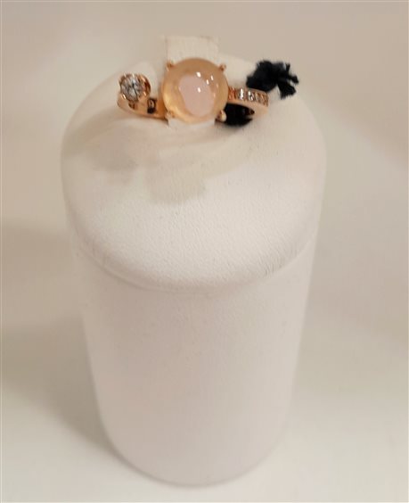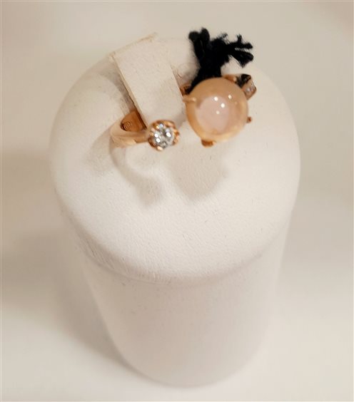 Anello in argento in bagno oro rosa con pietra rosa taglio tondo cabochon e zircone bianco. Anello aperto che consente di regolare la misura