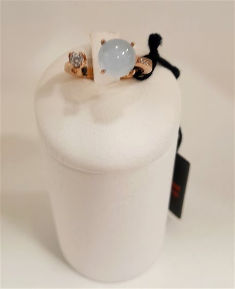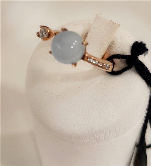 Anello con pietra tonda azzurro pallido taglio cabochon e zircone bianco. Anello aperto che consente di regolare la misura