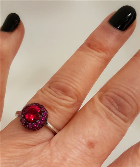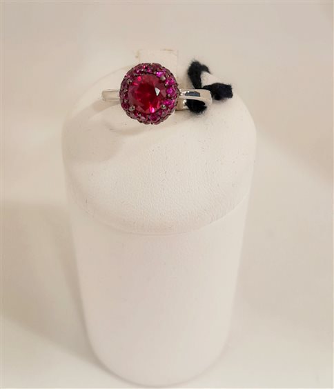 Delizioso anello a rosellina con zircone centrale rosso ciliegia e controno di zirconi in tonalità con castoni bruniti. Gambo sottile aperto per misura regolabile
