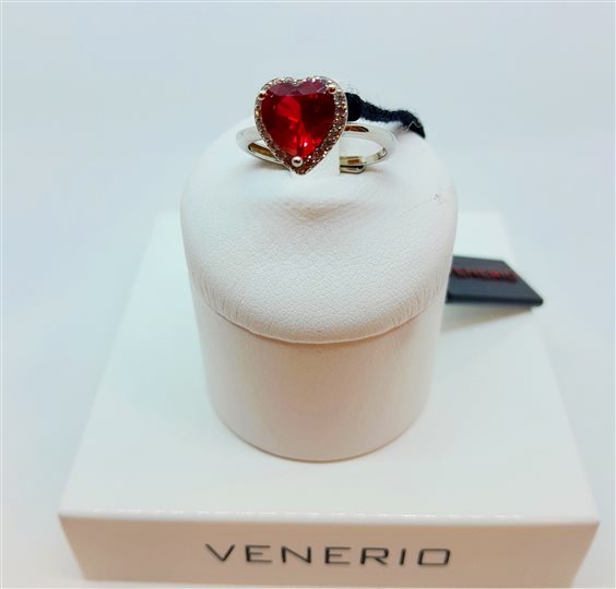 Anello in argento rodiato 925 con pietra rosso rubino taglio cuore e contorno di zirconi. Gambo aperto, misura regolabile.