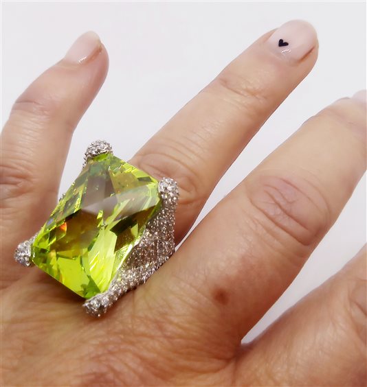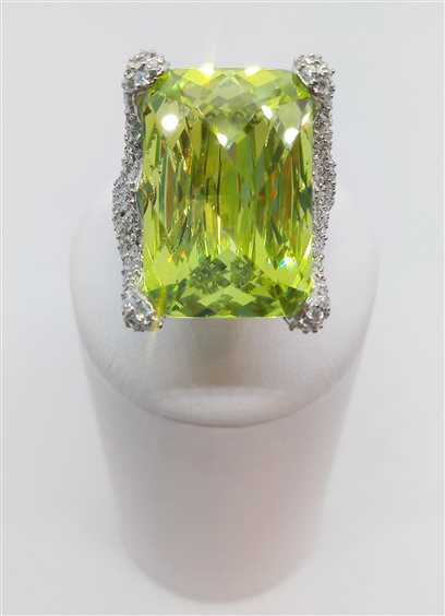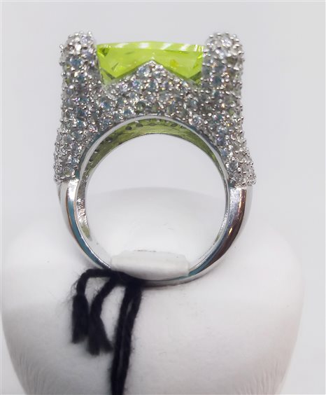 Anello in argento 925 con montatura a corona in pavé di zirconi bianchi con pietra rettangolare verde acido. Modello vintage, prezzo superpromo