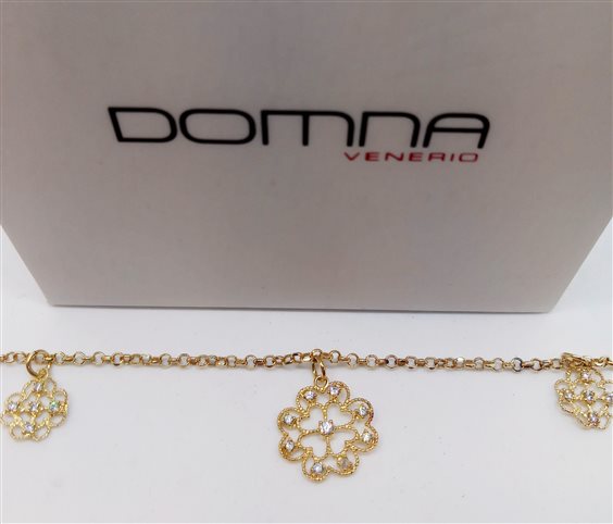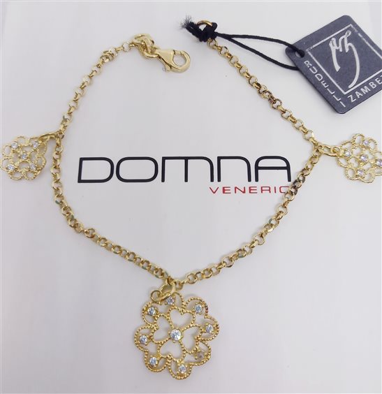VENERIO ARGENTO Bracciale maglia rolò diamantata con tre chokers a fiore con pietre. Argento 925 in bagno oro giallo 24 kt. Chiusura con moschettone. Gioiello anallergico, nichel free. Disponibile sullo shop girocollo coordinato.