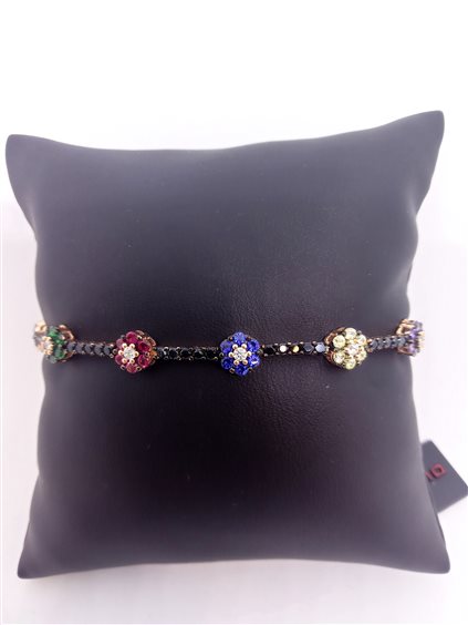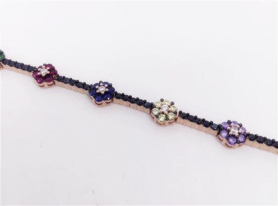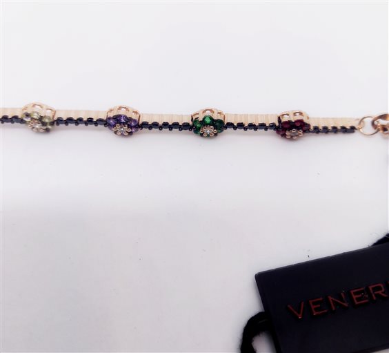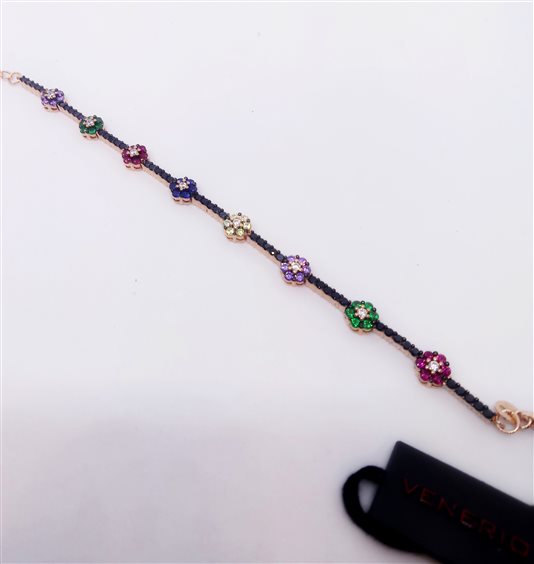 VENERIO ARGENTO Italian silver Jewelry Bracciale tennis multicolor con fiori in argento 925 placcato oro rosa 24 kt. Pietre montate a griffe. Chiusura con moschettone, prolunga a catena 3 cm Gioiello anallergico