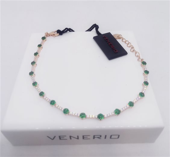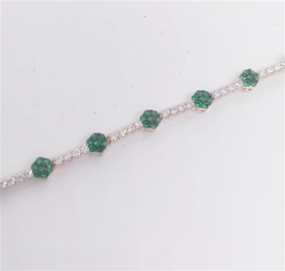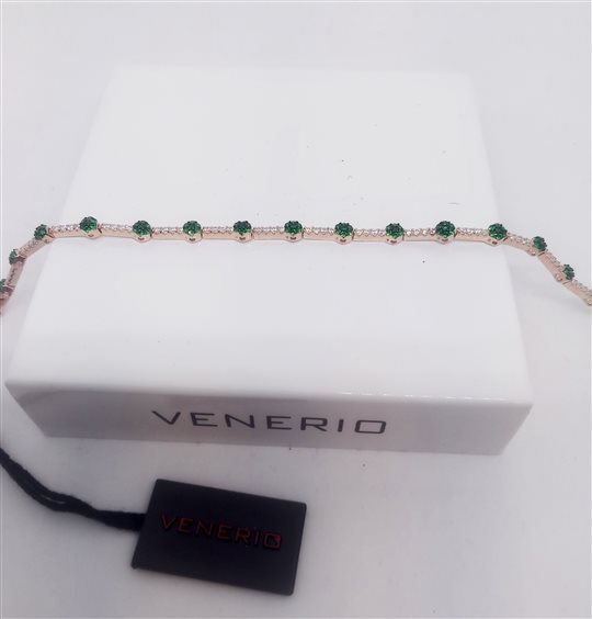 VENERIO ARGENTO Bracciale tennis fantasia in argento 925 in bagno oro rosa 18 kt con fiorellini circolari in zirconi verdi su base di zirconi bianchi. Chiusura con moschettone, prolunga 4 cm. Anallergico, nichel free.