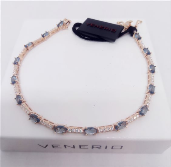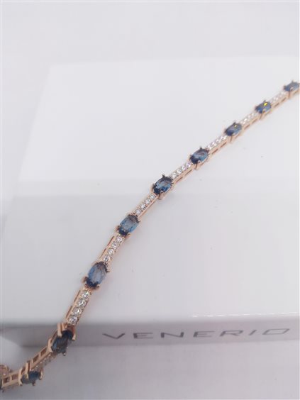 VENERIO ARGENTO Bracciale tennis fantasia in argento 925 in bagno oro rosa 18 kt con pietre azzurro intenso taglio ovale su base di zirconi bianchi. Catena maglia forzatina diamantata. Chiusura a incastro con doppio otto di sicurezza. Anallergico, nichel free.
