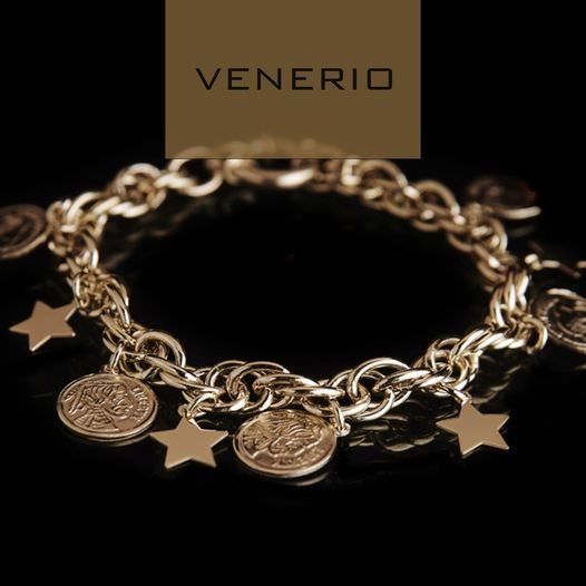 VENERIO ARGENTO Bracciale con charms in argento 925 placcato oro rosa. Base a catena con maglie ovali (1 cm circa)con inserto di 7 charms (3 monete e 4 stelle da 1 cm a 1,5 cm). Chiusura anello a molla diametro 1 cm.