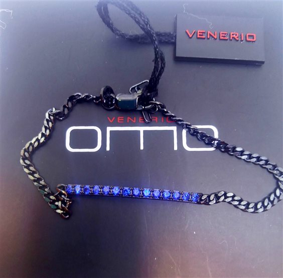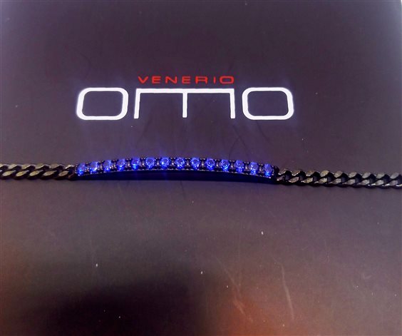 VENERIO ARGENTO COLLEZIONE OMO Bracciale maglia groumette con piastra tennis in zirconi blu incassati a griffes. Argento 925 con speciale brunitura lucida. Chiusura con moschettone, prolunga 2 cm. Gioiello anallergico, nichel free.