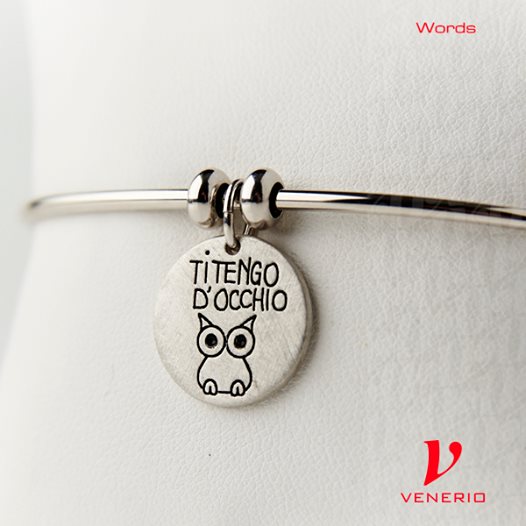 VENERIO ARGENTO Ciondolo della linea WORDS in argento satinato con incisione TI TENGO D'OCCHIO immagine GUFO Diametro 1,7 cm. Si può inserire nelle catene o nella base bracciale rigido della linea (non inclusi). Adatto a qualsiasi catena/bracciale o portachiavi compatibile con la contromaglia del ciondolo (0,5 cm).