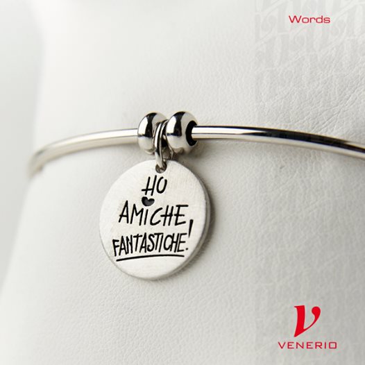 VENERIO ARGENTO Ciondolo della linea WORDS in argento satinato con incisione HO AMICHE FANTASTICHE immagine CUORE Diametro 1,7 cm. Si può inserire nelle catene o nella base bracciale rigido della linea (non inclusi). Adatto a qualsiasi catena/bracciale o portachiavi compatibile con la contromaglia del ciondolo (0,5 cm).