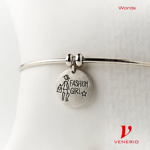 VENERIO ARGENTO Ciondolo della linea WORDS in argento satinato con incisione FASHION GIRL immagine RAGAZZA CON SHOPPER E STELLA Diametro 1,7 cm. Si può inserire nelle catene o nella base bracciale rigido della linea (non inclusi). Adatto a qualsiasi catena/bracciale o portachiavi compatibile con la contromaglia del ciondolo (0,5 cm).