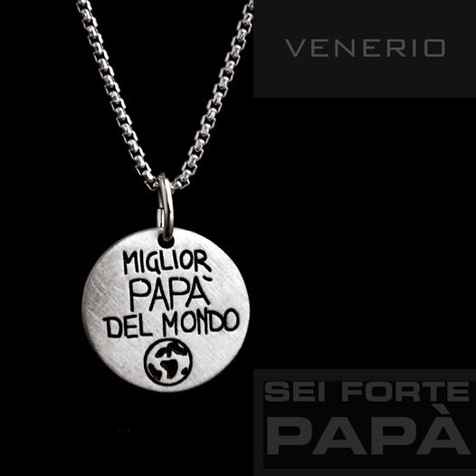 VENERIO ARGENTO Ciondolo della linea WORDS in argento satinato con incisione MIGLIOR PAPA' DEL MONDO con immagine mondo. Diametro 1,7 cm. Si può inserire nelle catene o nella base bracciale rigido della linea. Adatto a qualsiasi catena/bracciale o portachiavi compatibile con la contromaglia del ciondolo (0,5 cm).