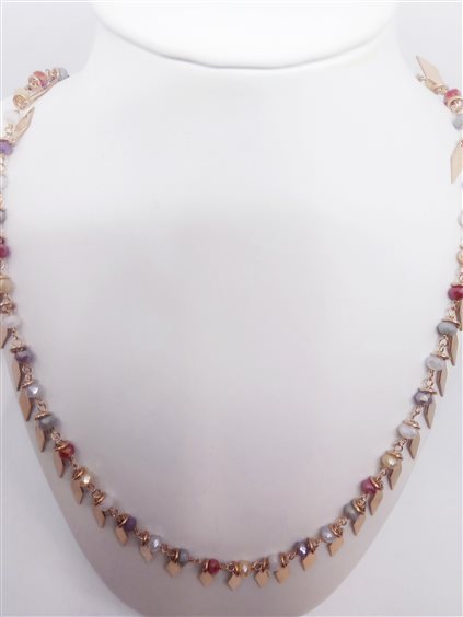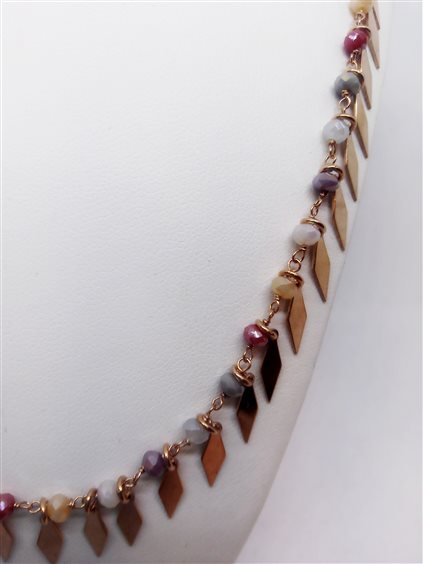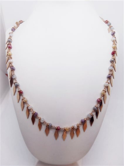 VENERIO ARGENTO Girocollo in argento 925 in bagno oro rosa 18 kt con pendenti a losanga alternati a palline sfaccettate in quarzo multicolor bianco, grigio, rosso. Prolunga 3 cm. Chiusura con anellino a molla. Anallergico, nichel free.
