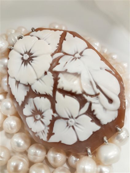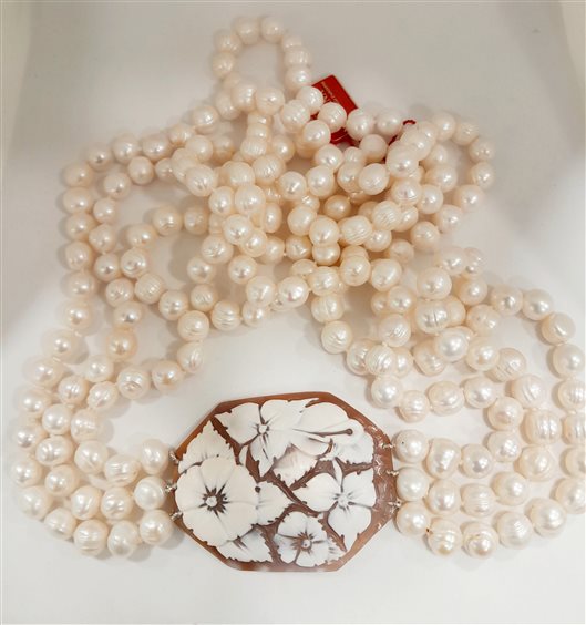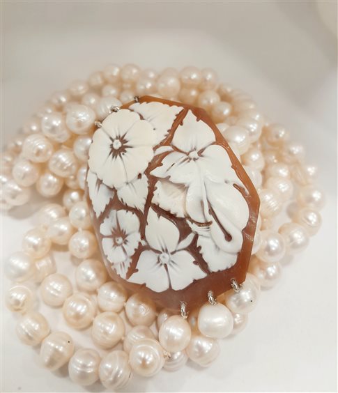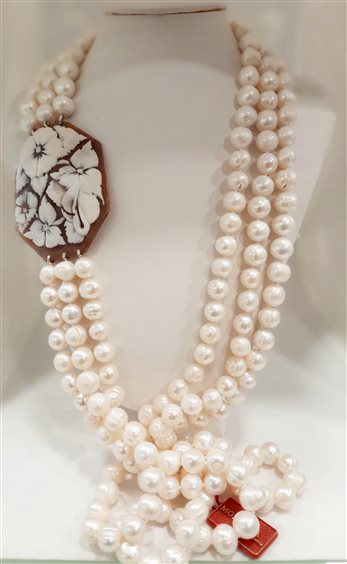 Bellissima collana a tre fili di perle barocche d'acqua dolce a scalare con medaglione cameo ottagonale a motivo floreale da indossare lateralmente.