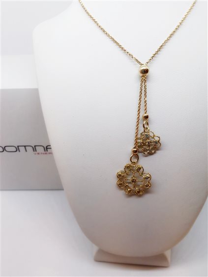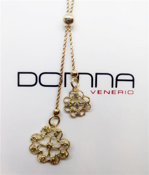 VENERIO ARGENTO Girocollo maglia forzatina diamantata, centrale due fiori pendenti con pietre. Argento 925 in bagno oro giallo 24 kt. Chiusura con moschettone. Gioiello anallergico, nichel free. Sullo shop disponibile bracciale coordinato.