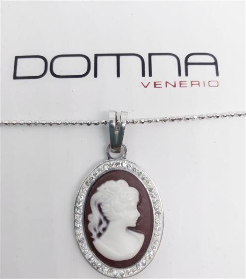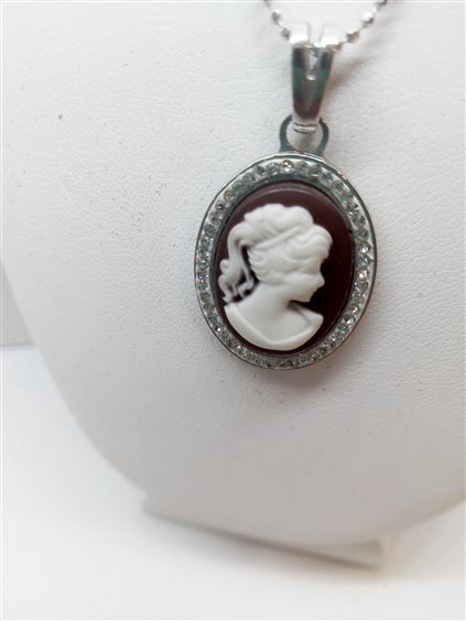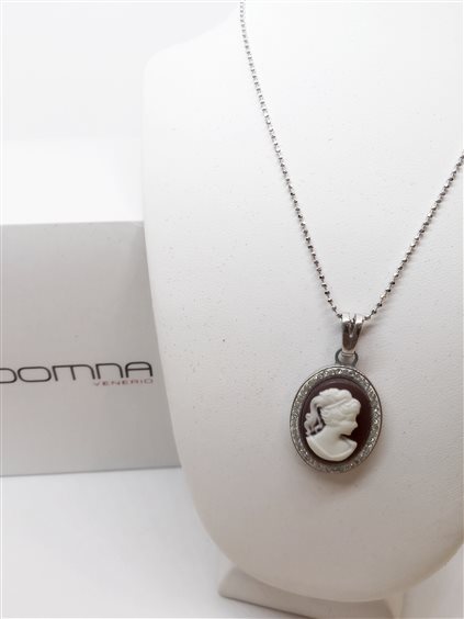 VENERIO ARGENTO Girocollo cameo, lavorazione artigiana ovale con contorno di zirconi, fondo foderato. Argento 925 rodiato. Catena maglia pallina diamantata, chiusura con moschettone. Gioiello anallergico, nichel free.