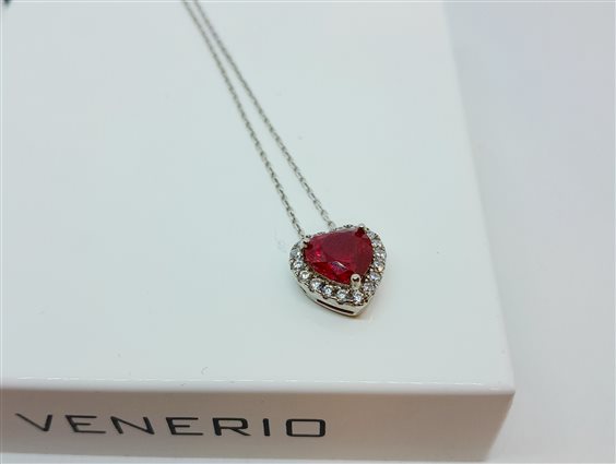 Girocollo in argento 925 rodiato, catena maglia forzatina diamantata chiusura con moschettone, prolunga 4 cm. Pendente pietra taglio cuore rosso rubino con contorno di zirconi bianchi.