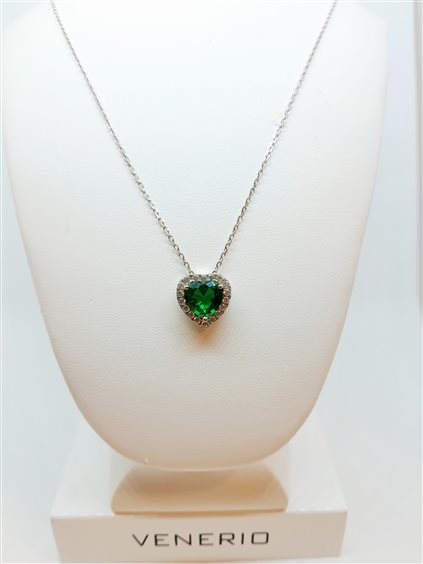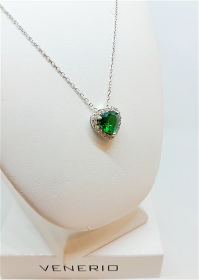 Girocollo in argento 925 rodiato, catena maglia forzatina diamantata chiusura con moschettone, prolunga 4 cm. Pendente pietra taglio cuore verde smeraldo con contorno di zirconi bianchi.