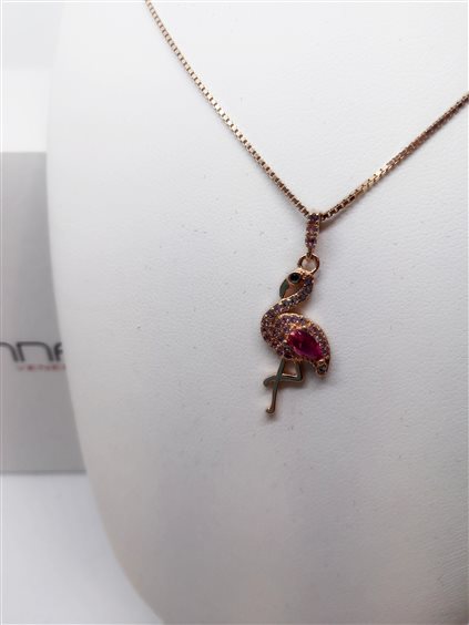 VENERIO ARGENTO Girocollo fenicottero, argento 925 in bagno oro rosa 24 kt. Pietre rosa e fucsia con occhio nero. Maglia catena veneta, chiusura con anellino a molla. Gioiello anallergico, nichel free.