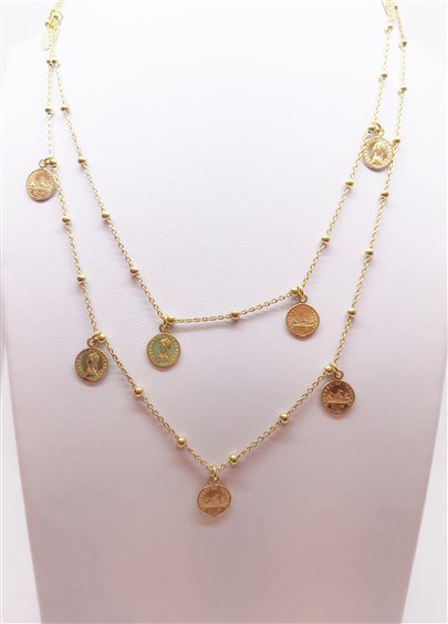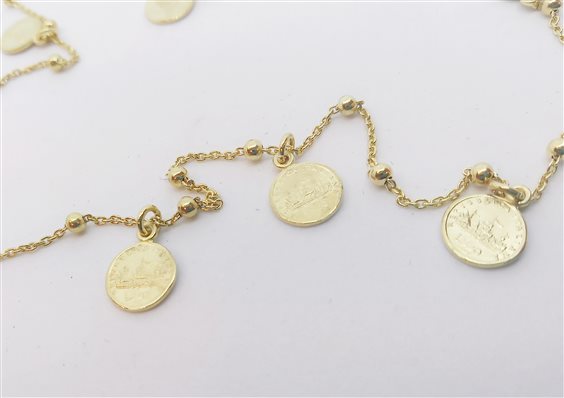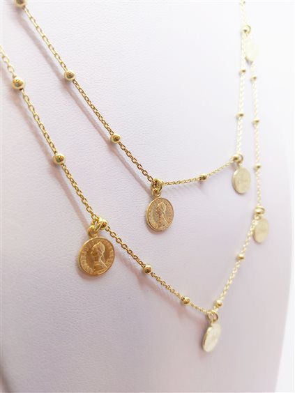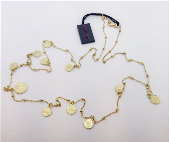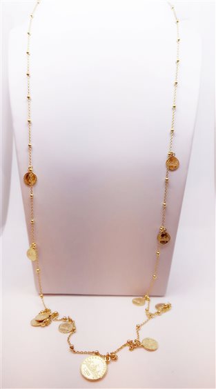 VENERIO ARGENTO Collana lunga in argento 925 placcato oro giallo 24kt. Base catena con palline lisce con piccoli charms a monetina 0.8cm e monetina centrale 1.3 cm. Chiusura con moschettone. Indossabile lunga o a due giri.
