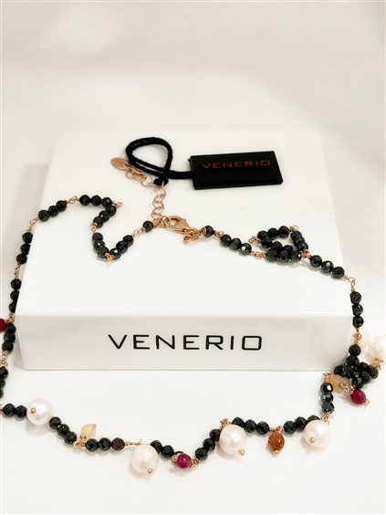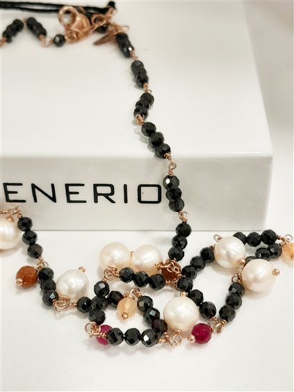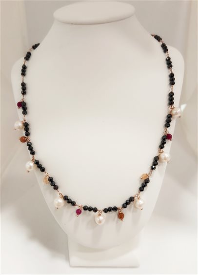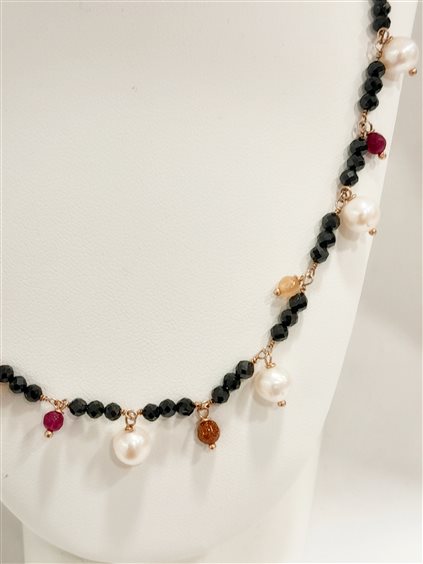 Girocollo incatenato con base in onice nera sfaccettaata e chokers in pietre dure rosso, arancio e perle d'acqua dolce. Chiusura con moschettone, prolunga 4 cm