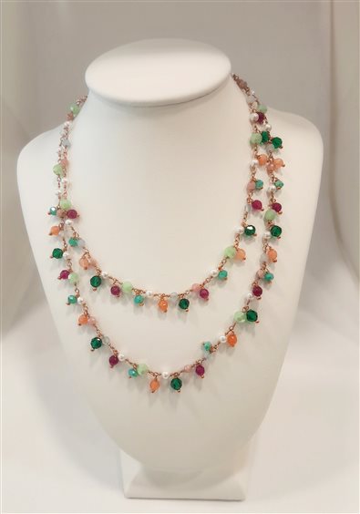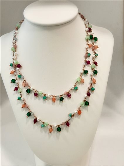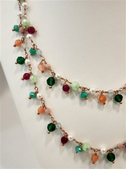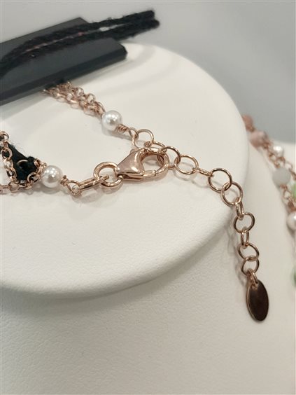 Girocollo in argento 925 con galvanica oro rosa. Doppio filo a scalare (42/54 cm) con pendenti multicolor e perle. Maglia rolò diamantata, prolunga 3 cm, chiusura con moschettone. Disponibile bracciale abbinato