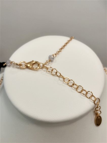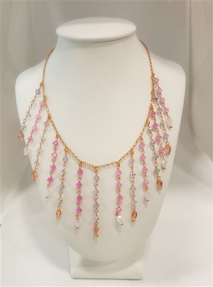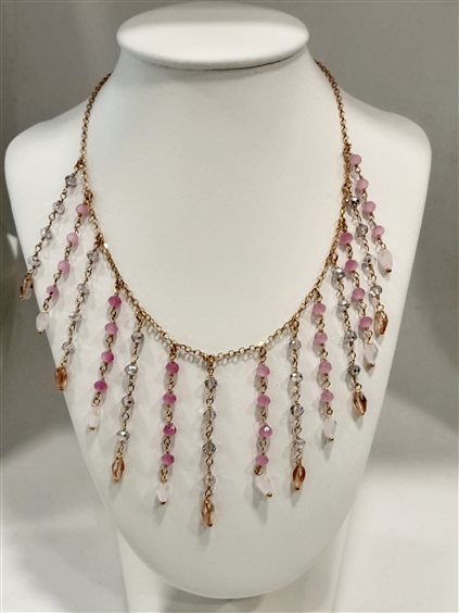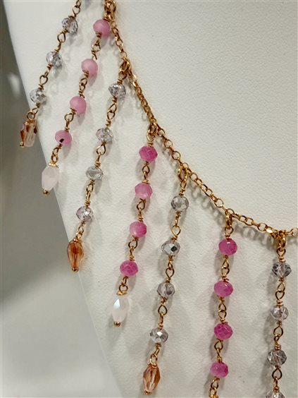 Girocollo rosario in argento 925 con galvanica in oro giallo. Centrale in fili di pietre colorate rosa, grigio a scalare. Catena maglia rolò diamantata, prolunga 5 cm, chiusura con moschettone