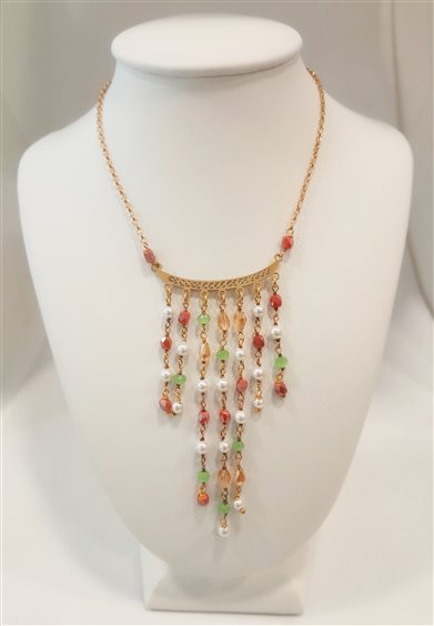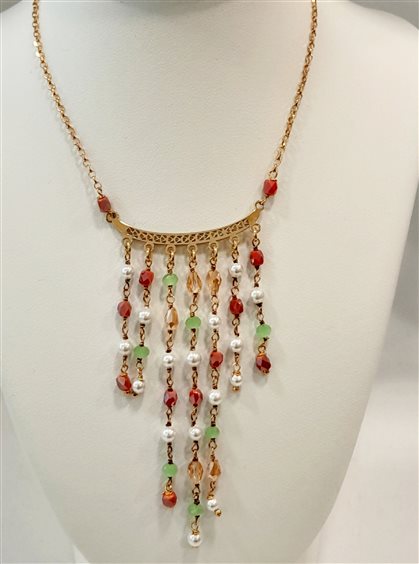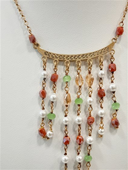 Girocollo rosario in argento 925 con galvanica in oro giallo. Centrale in fili di pietre colorate arancione,verde, trasparente e perle. Catena maglia rolò diamantata, prolunga 4 cm, chiusura con moschettone
