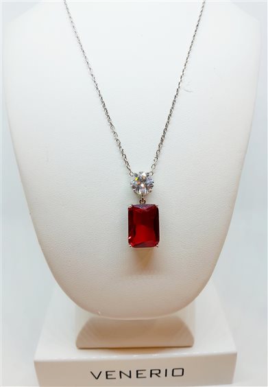 Girocollo in argento 925 rodiato, catena maglia forzatina diamantata chiusura con anellino a molla, prolunga 4 cm. Pendente con pietra rettangolare rosso rubino sormontato da pietra bianca con snodo.