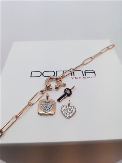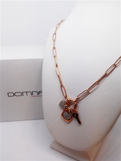 VENERIO ARGENTO Girocollo in argento 925 in bagno oro rosa 24 kt. Pendente con tre chokers in pavé di zirconi inseriti e removibili in un anello a molla. Chiusura con moschettone, prolunga 4 cm.