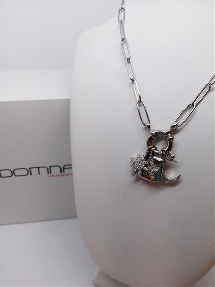 VENERIO ARGENTO Girocollo in argento 925 rodiato. Pendente con tre chokers in pavé di zirconi inseriti e removibili in un anello a molla. Chiusura con moschettone, prolunga 4 cm.