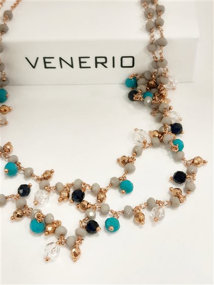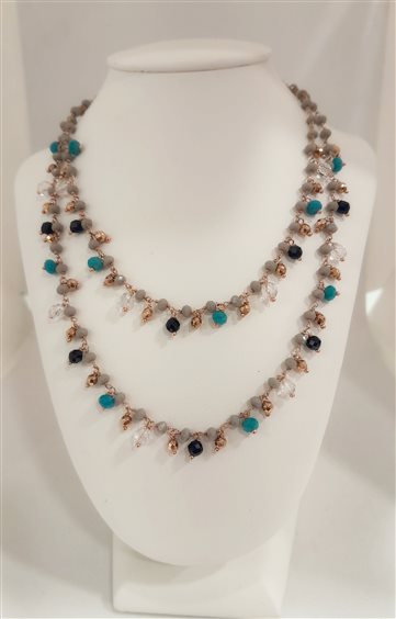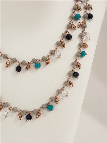 Girocollo a rosario incatenato a due fili, maglia catena forzatina diamantata, base di quarzo grigio con chokers in pietre dure nero e turchese, trasparente e argento sfaccettato. Prolunga 3 cm, chiusura con anellino a molla.