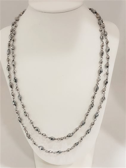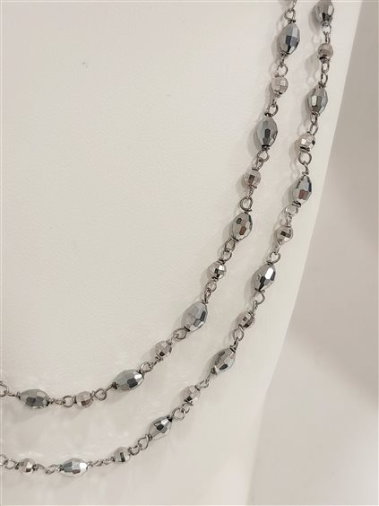 Collana incatenata con semi d'argento diamantati alternati ovali e tondi. Chiusura con anellino a molla. Indossabile a due giri.