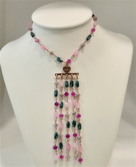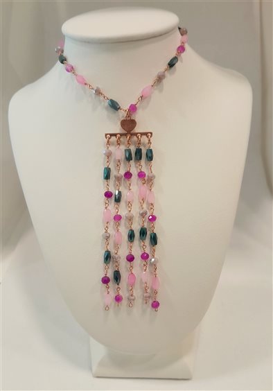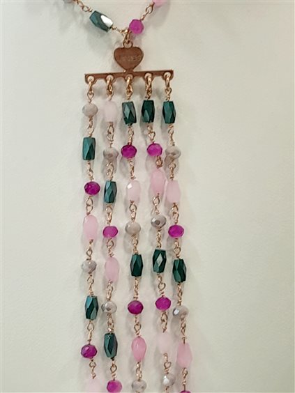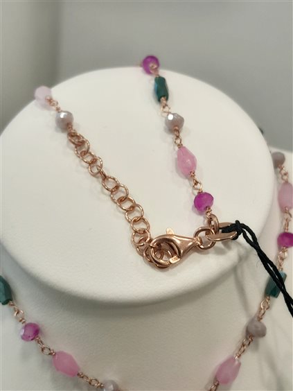 Girocollo rosario in argento 925 con galvanica in oro rosa. Pendente in fili di pietre colorate rosa, grigio, fucsia. Prolunga 4 cm, chiusura con moschettone
