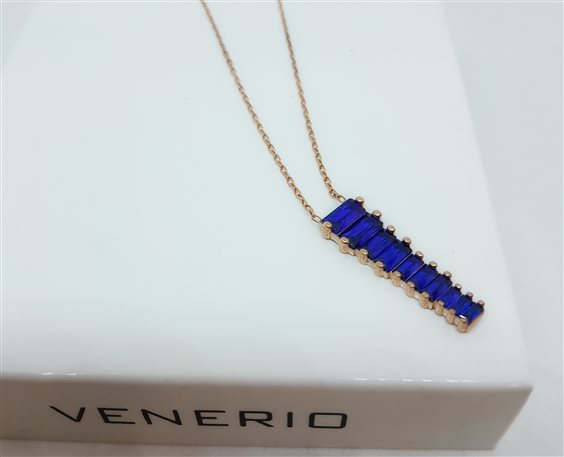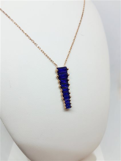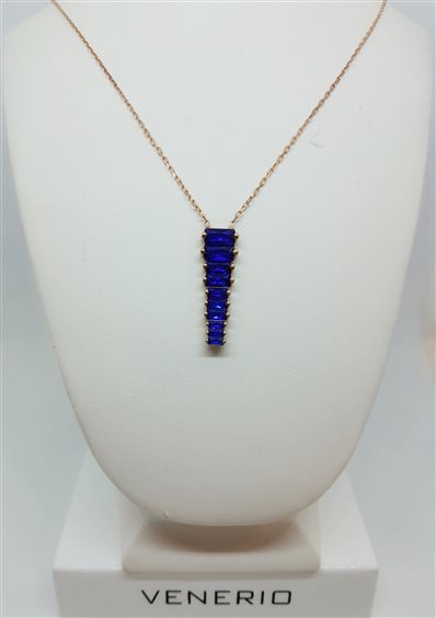 Girocollo in argento 925 in bagno oro rosa, maglia forzatina, chiusura con anellino a molla. Prolunga 3 cm. Pendente con pietre blu zaffiro taglio rettangolare a scalare.