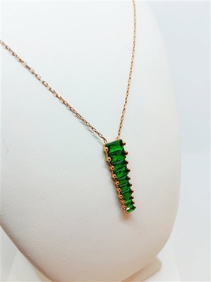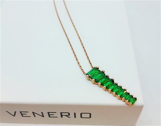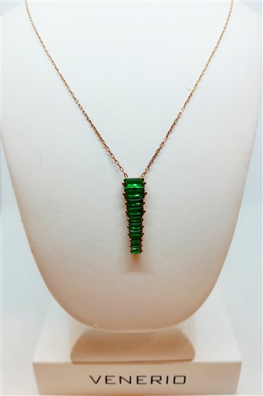 Girocollo in argento 925 in bagno oro rosa, maglia forzatina, chiusura con anellino a molla. Prolunga 3 cm. Pendente con pietre verde smeraldo taglio rettangolare a scalare.