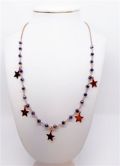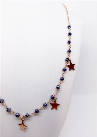 VENERIO ARGENTO Girocollo in argento 925 placcato oro rosé 24kt base catena rolò con incatenatura di cristalli color blu alternati a stelle in argento rosé. Chiusura con moschettone, prolunga 3.5 cm.
