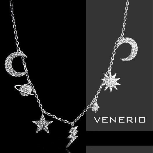 VENERIO ARGENTO Girocollo PIANETI in argento e pavé di cristalli bianchi. Catena maglia rolò diamantata, lunghezza 37 cm estendibile a 41 cm con sette ciondoli stella, sole, pianeti in pavé (dimensioni da o,5 a 1,5 cm circa) Chiusura moschettone.