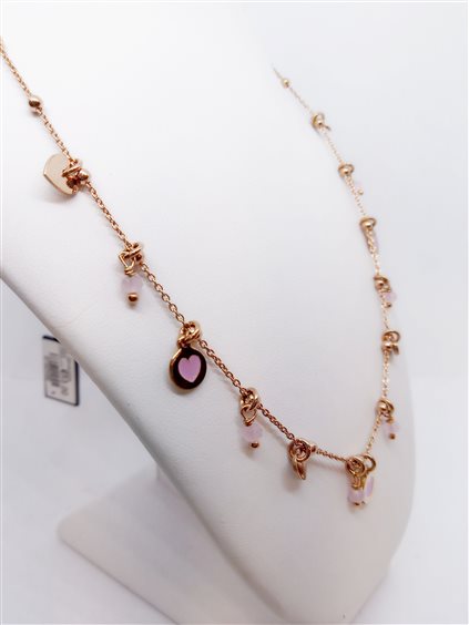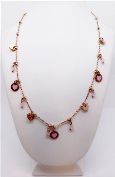 VENERIO ARGENTO Collana in argento placcato oro rosa con pendenti charms alternati: cuoricini sagomati e cuoricini color rosa smaltati su dishetto d'argento, piccoli cristalli rosa. Lunghezza 40 cm estendibile a 42. Chiusura con moschettone