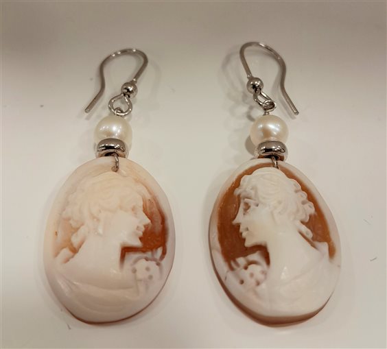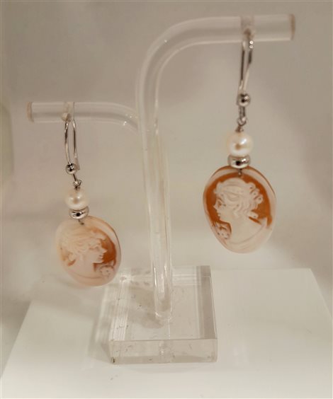 Orecchini in argento 925 con pendenti ovali cameo profilo di donna, chiusura ad amo, inserto perla di acqua dolce.